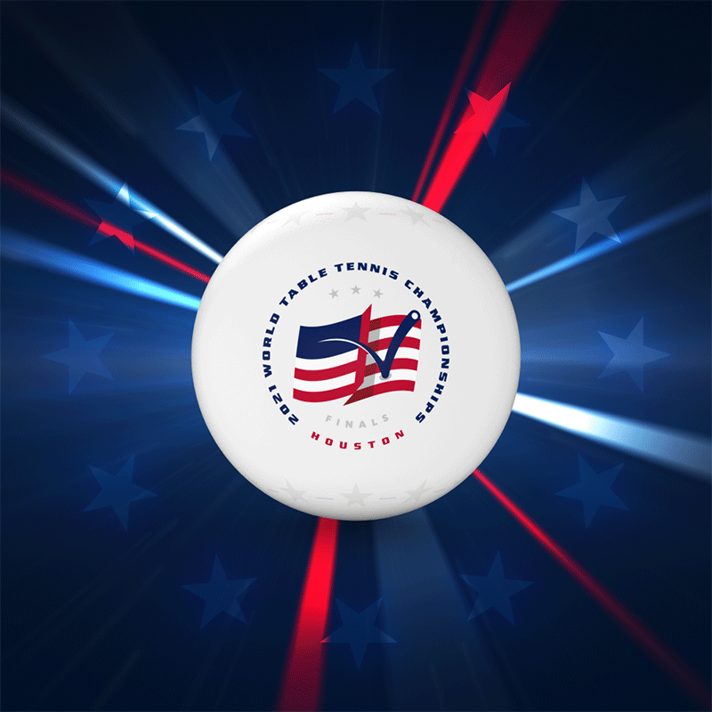 The video clip showcases a table tennis ball ornated with the 2021 World Table Tennis Championships Finals logo and the USA flag’s colours in the background.