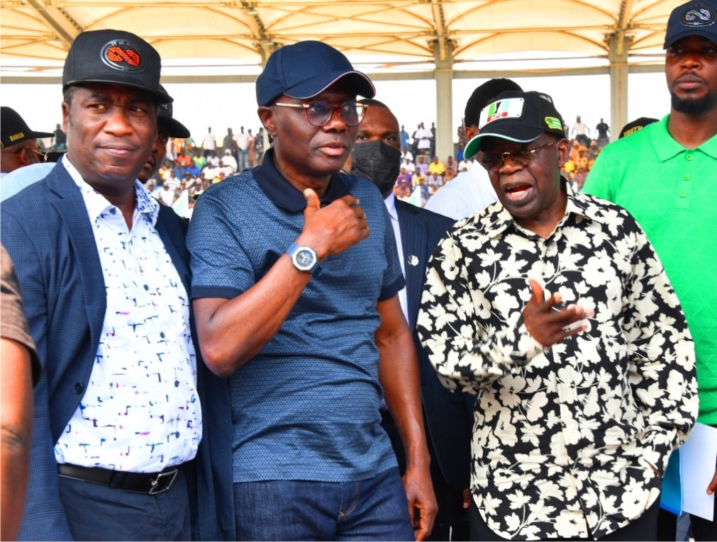L-R: Lagos Deputy Governor, Dr. Obafemi Hamzat, Governor Babajide Sanwo-Olu and National Leader of the All Progressives Congress (APC), Asiwaju Bola Tinubu during the South West Youths declaration for Tinubu rally, at the Mobolaji Johnson Arena, Onikan, on Saturday, 16 April 2022.